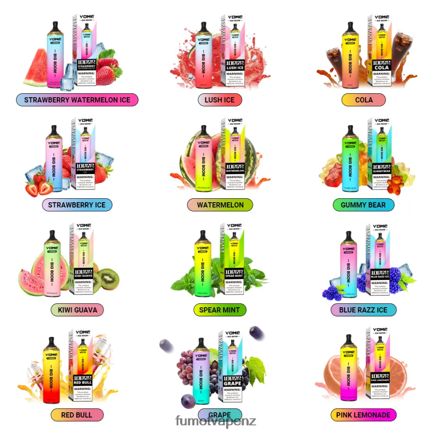The Vome Big Boom 10000 Puffs disposable vape pen is a trending vape pod device from Fumot Tech!Each Big Boom 10000 disposable vape pen is pre-filled with 20ml, which can last up to 10000 puffs. This vape device has a built-in 850mAh rechargeable battery and a Type-C charging port on the bottom. The airflow control knob can be easily Rotate up to 30 degrees, you can control the size of the smoke as you like.